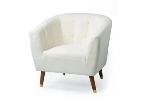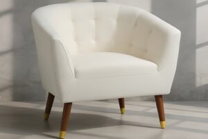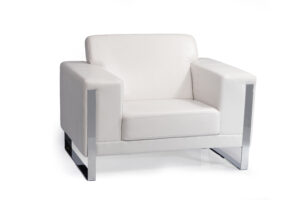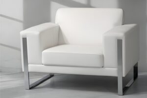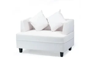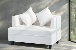 The Alba Sofà combines plastic feet, hardwood, and plywood for a sturdy build. Upholstered in white PU with a waterproof coating, it offers a sleek, modern look—ideal for contemporary spaces.